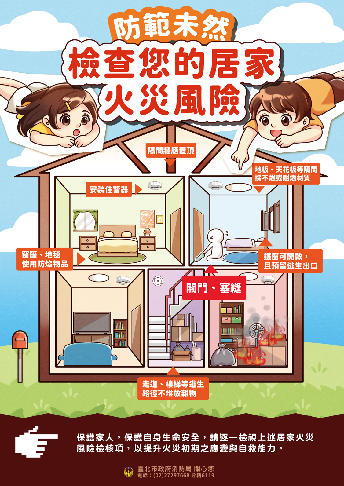 校園公告 公告主旨 住宅防火宣導-檢查您的居家火災風險 發佈日期 2026 年 2 月 02 日 發佈單位 校安中心 公告類別 最新消息, 學生園地, 來文宣導 公告等級 轉知 點閱次數 115 公告內容 檢查您的居家火災風險 滅火器操作注意事項 相關附件 檢查您的居家火災風險 檢查您的居家火災風險 檔案名稱檔案大小檔案格式下載檢查您的居家火災風險.png2.05 MB新視窗開啟檔案 檢查您的居家火災風險.png 滅火器操作注意事項 滅火器操作注意事項 檔案名稱檔案大小檔案格式下載滅火器操作注意事項.jpg376.88 KB新視窗開啟檔案 滅火器操作注意事項.jpg 相關連結 (一)住宅防火篇地板及隔間採不燃或耐燃材質;鐵窗預留逃生口;走道樓梯不堆雜物 (二) 滅火器操作方式 (三)養成「人離火熄」的習慣烹調時遵循人離火熄原則避免火災。 【2026-02-03】114學年度教育盃中小學民俗體育運動錦標賽 【2026-02-02】有關現職人員經核准兼任或代理他機關(構)學校職務依「軍公教人 ...