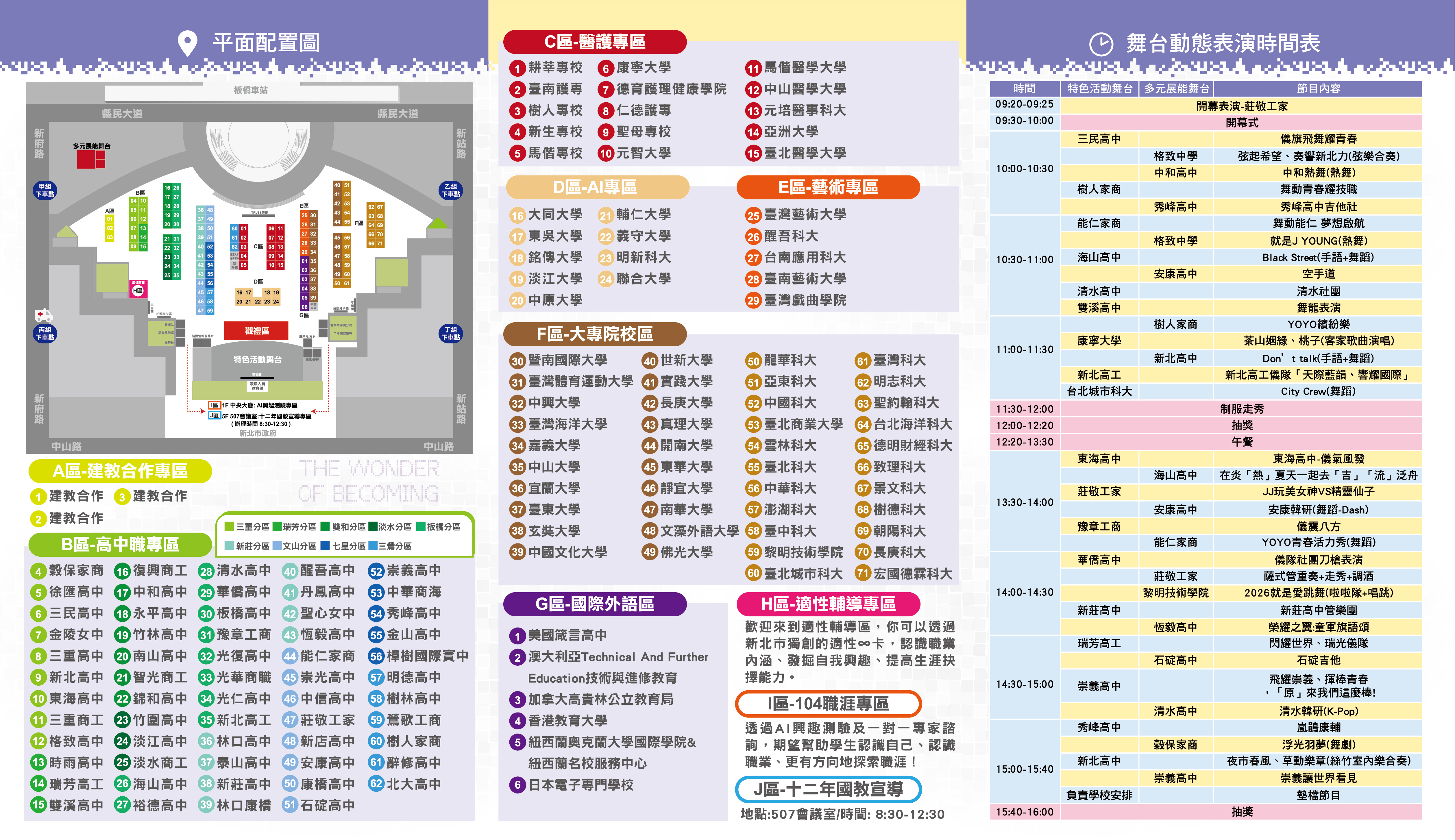 | 公告內容 | 「2026年新北國際教育博覽會」 說明: 一、依據「2026年新北國際教育博覽會實施計畫」辦理。 二、新北市政府教育局訂於115年3月21日(星期六)上午8時至下午4時假新北市政府市民廣場(新北市板橋區中山路一段161號,板橋車站3A出口)辦理旨揭活動。 三、本次博覽會擴大邀請全國71所大專院校及60所新北市優質高中職學校參與,共有超過130所學校特色課程體驗,並設有十大專區體驗,涵蓋建教合作專區、高中職專區、醫護專區、AI專區、藝術專區、大專院校專區、國際外語專區、適性輔導專區、104職涯專區及十二年國教宣導專區等,另安排超過30個精彩的表演節目,歡迎北北基桃國高中學生及家長來現場參加,瞭解新北市優質高中職學校及大專院校特色。 |