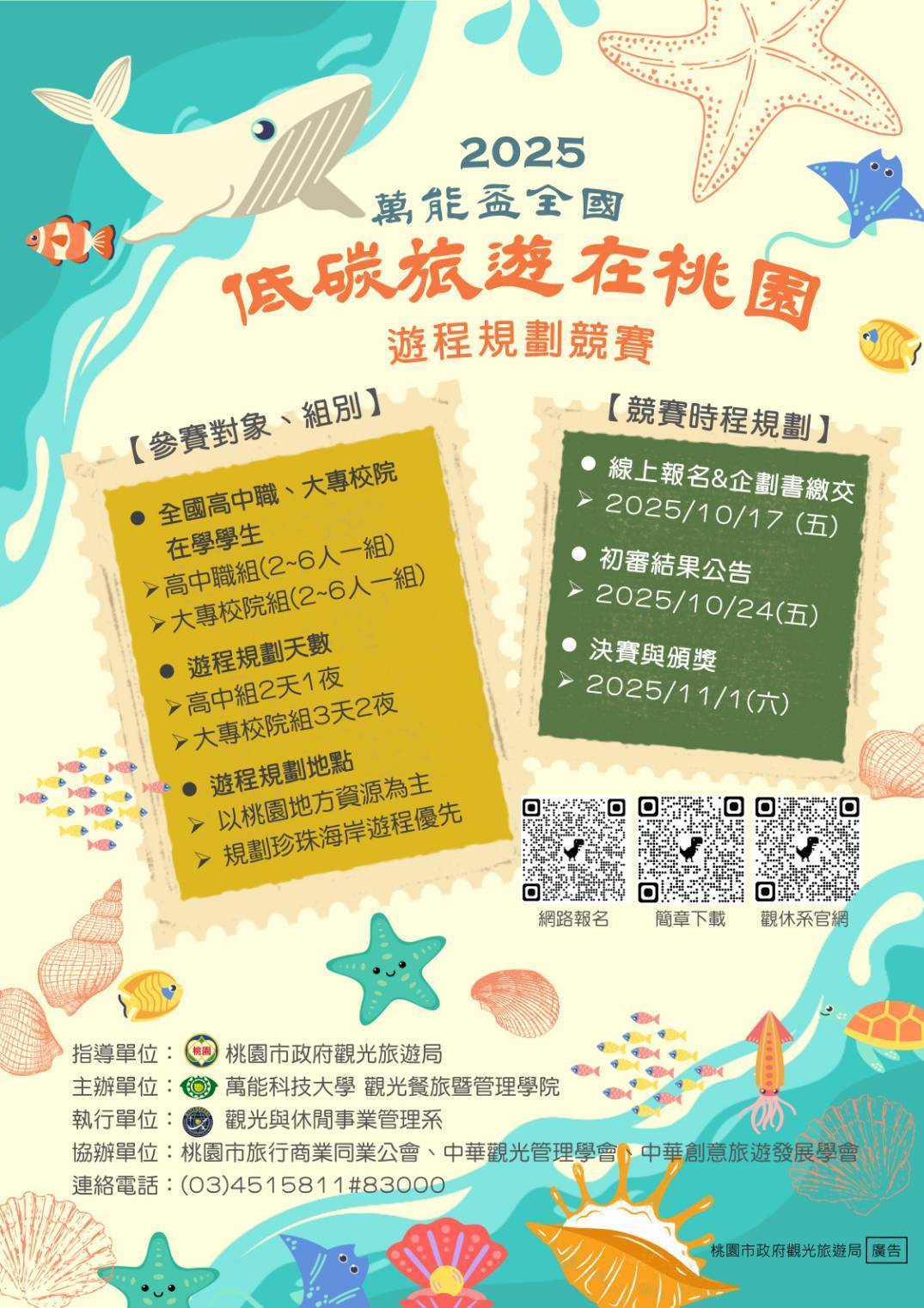 校園公告 公告主旨 『低碳旅遊在桃園』遊程規劃競賽,歡迎有興趣的同學踴躍報名參加 發佈日期 2025 年 9 月 16 日 發佈單位 衛生組 公告類別 學生園地 公告等級 轉知 點閱次數 146 公告內容 相關附件 2025萬能盃全國『低碳 旅遊在桃園』遊程規劃競賽_簡章 2025萬能盃全國『低碳 旅遊在桃園』遊程規劃競賽_簡章 檔案名稱檔案大小檔案格式下載2025萬能盃全國『低碳 旅遊在桃園』遊程規劃競賽_簡章.pdf801.23 KB新視窗開啟檔案 2025萬能盃全國『低碳 旅遊在桃園』遊程規劃競賽_簡章.pdf 【2025-09-16】「2025減碳大作戰」與「我是氣候行動家」校園環境教育推廣計畫, ... 【2025-09-16】114學年度遙控無人機證照研習