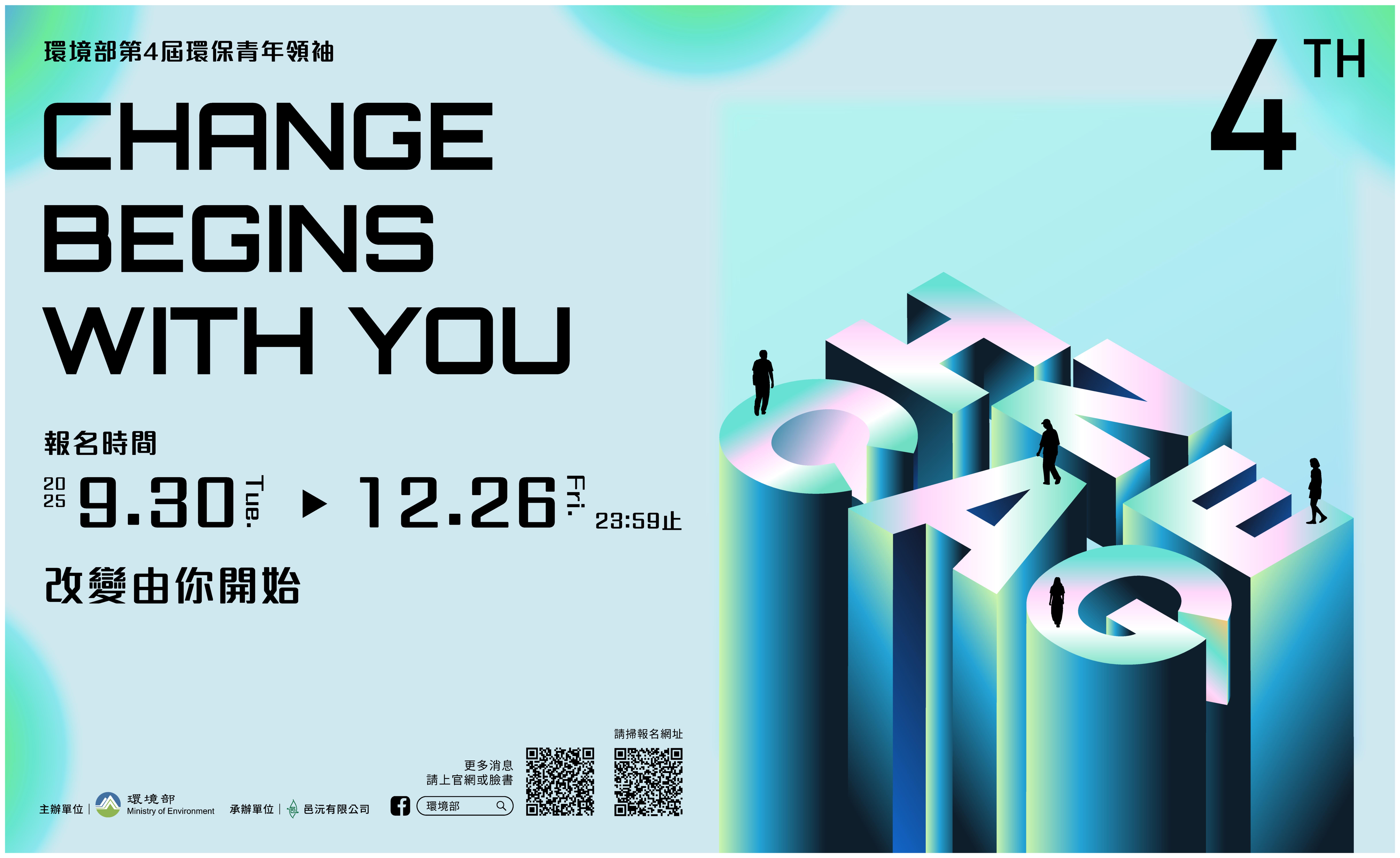 | 公告內容 | 環境部辦理「第4屆環保青年領袖甄選活動」,邀請30歲以下、關注環境議題並具影響力的青年踴躍報名,一同展現環保行動力! 活動內容: 環境部辦理「第4屆環保青年領袖甄選活動」,歡迎30歲以下關注環境議題的青年踴躍參加,展現行動力與影響力。 報名期間:即日起至114年12月26日(星期五)23:59 參加資格:民國85年1月1日(含)以後出生,具中華民國國籍並設有戶籍。 報名方式:採線上報名(https://reurl.cc/0Wxvvo)。 活動資訊查詢:(https://youth4earth.com.tw/)。 獲獎名額與獎勵: 1.環境領袖獎2名(第1-2名):12,000元等值禮券、獎座1座、獎狀1紙及全額補助參與該部指定之國際環境教育會議1場(含來回機票、食宿、會議註冊費等)。 2.環境行動獎3名(第3-5名)::8,000元等值禮券、獎 座1座及獎狀1紙。 3.評審團特別獎(經評審委員共識同意後增設):鼓勵參賽者中具潛力、具良好人格特質或有特殊面向成就之青年,並提供每人6,000元等值禮券,予以獎勵。