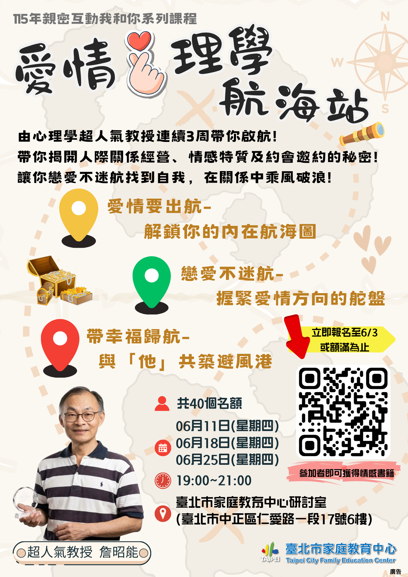| 公告內容 | 臺北市家庭教育中心親密互動我和你系列課程–愛情心理學航海站課程 說明: 一、課程以人際關係及情感互動為題,藉由講師互動分享、小組討論等方式,探討人際關係經營、情感特質、約會邀約及拒絕等內容,對象為一般市民,全程參與之公務人員可申請終身學習(研習)時數6小時。 二、活動時間為115年6月11日、6月18日及6月25日,連續3週於星期四晚間7時至9時,報名自即日起至6月3日或額滿為止,名額共40位,額滿採候補報名登記制,報名連結如下:https://forms.gle/pY1wnefH1LRKfemn8 。 三、臺北市家庭教育中心『親密互動我和你–愛情心理學航海站』課程,於115年6月11日至6月25日連續3週於星期四晚間7時至9時,假臺北市家庭教育中心舉辦,活動名額為40人,活動全程免費參與,詳細內容可於中心網站(https://family.gov.taipei )課程與活動瀏覽及下載, 相關報名問題請洽25419690轉605。 |