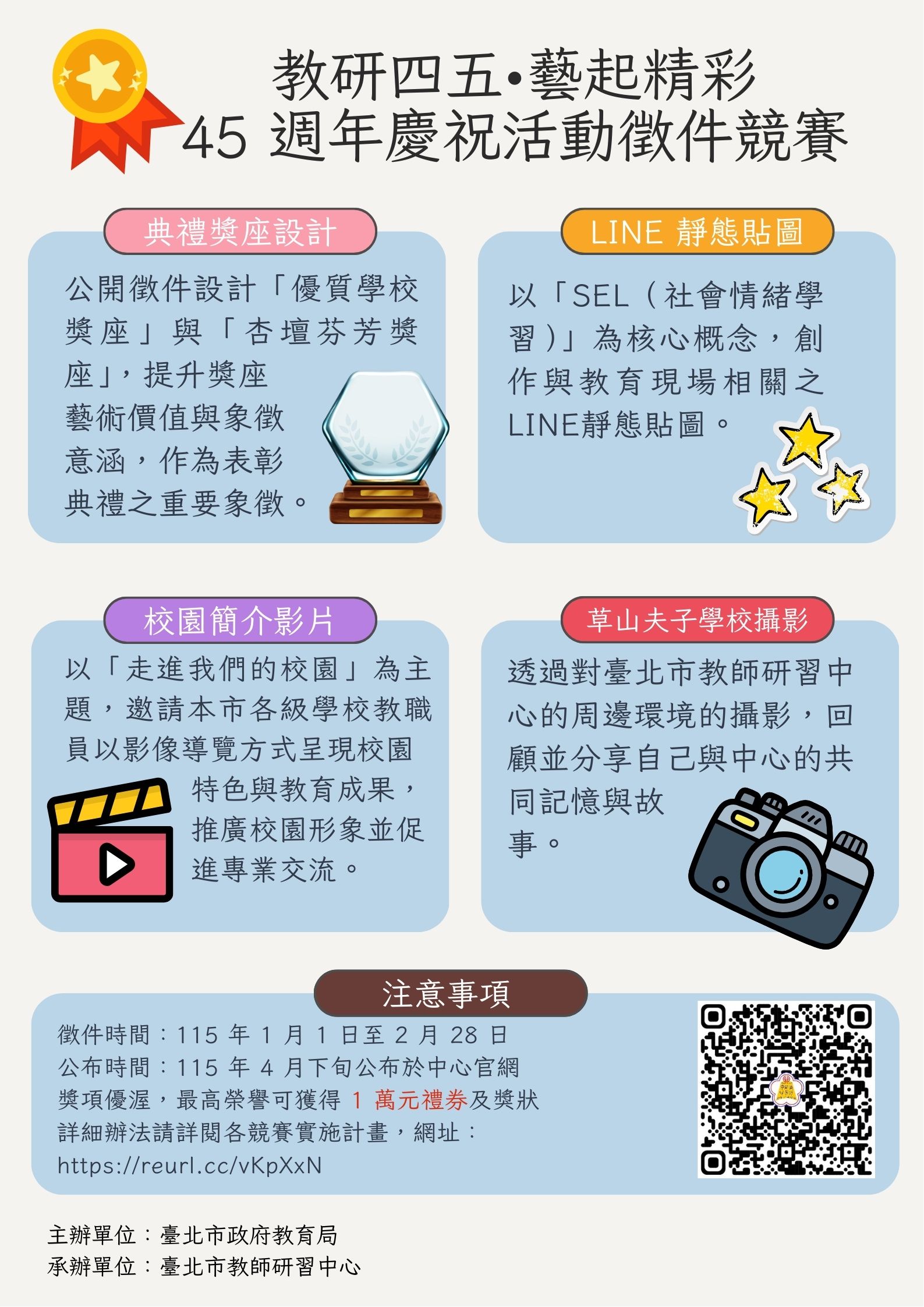 校園公告 公告主旨 臺北市教師研習中心辦理45週年慶競賽 發佈日期 2025 年 12 月 24 日 發佈單位 教學組 公告類別 最新消息 公告等級 轉知 點閱次數 251 公告內容 臺北市教師研習中心辦理45週年慶競賽 臺北市教師研習中心辦理45週年慶競賽 檔案名稱檔案大小檔案格式下載27649769_1146003728.pdf304.51 KB新視窗開啟檔案 27649769_1146003728.pdf (點擊下載檔案) 27649769_1146003728 相關附件 臺北市教師研習中心辦理45週年慶競賽 臺北市教師研習中心辦理45週年慶競賽 檔案名稱檔案大小檔案格式下載27649769_1146003728_ATTCH1.pdf316.01 KB新視窗開啟檔案27649769_1146003728_ATTCH2.pdf241.22 KB新視窗開啟檔案 27649769_1146003728_ATTCH1.pdf27649769_1146003728_ATTCH2.pdf 臺北市教師研習中心辦理45週年慶競賽 臺北市教師研習中心辦理45週年慶競賽 檔案名稱檔案大小檔案格式下載27649769_1146003728_ATTCH3.pdf267.46 KB新視窗開啟檔案27649769_1146003728_ATTCH4.pdf240.33 KB新視窗開啟檔案 27649769_1146003728_ATTCH3.pdf27649769_1146003728_ATTCH4.pdf 臺北市教師研習中心辦理45週年慶競賽 臺北市教師研習中心辦理45週年慶競賽 檔案名稱檔案大小檔案格式下載27649769_1146003728_ATTCH5.jpg432.98 KB新視窗開啟檔案 27649769_1146003728_ATTCH5.jpg 【2025-12-24】115年度教育部國民及學前教育署推動高級中等學校創新教學工作創 ... 【2025-12-24】國防部憲兵指揮部94週年部慶活動