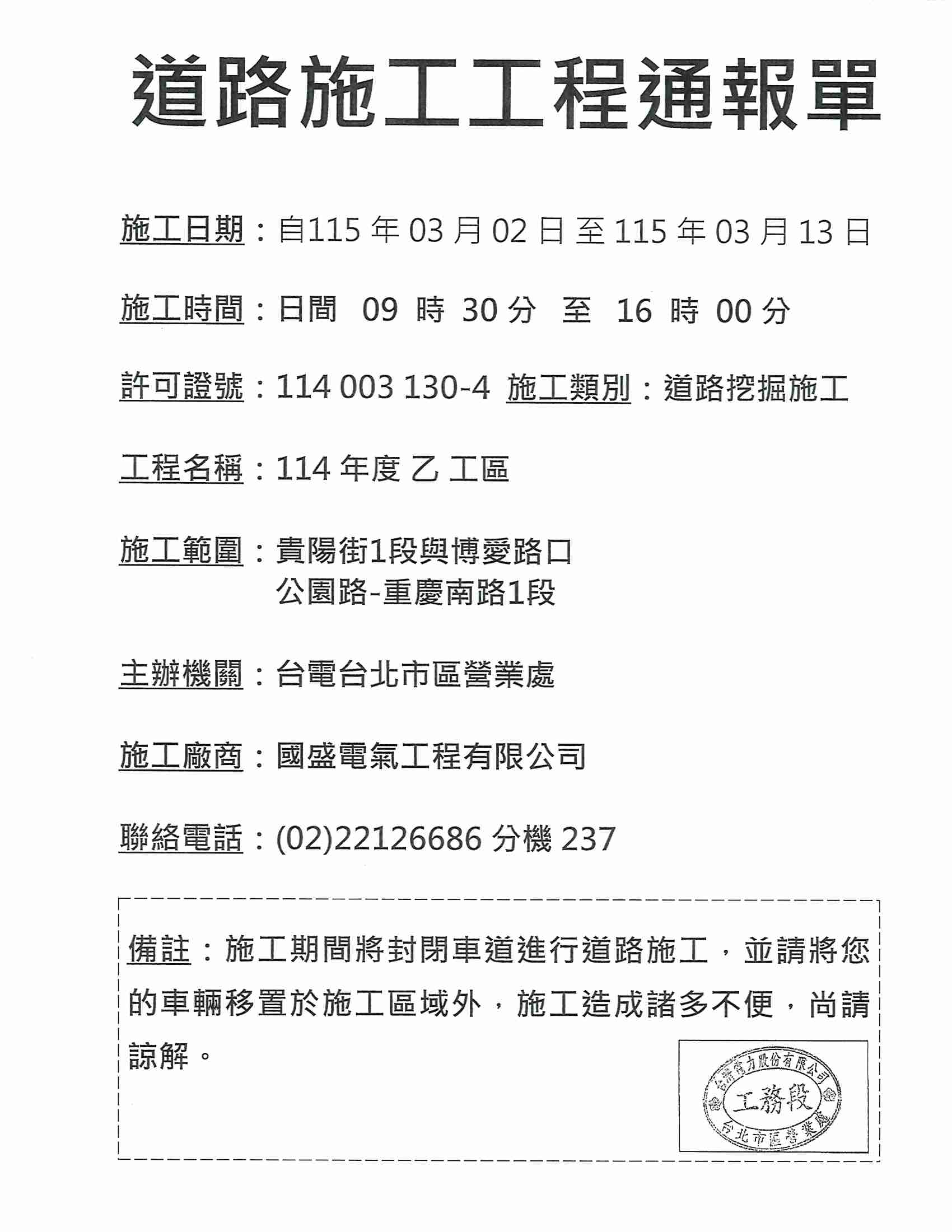 | 公告內容 | 依據臺電臺北市區營業處通知,貴陽街一段將辦理道路挖掘施工,相關資訊如下: