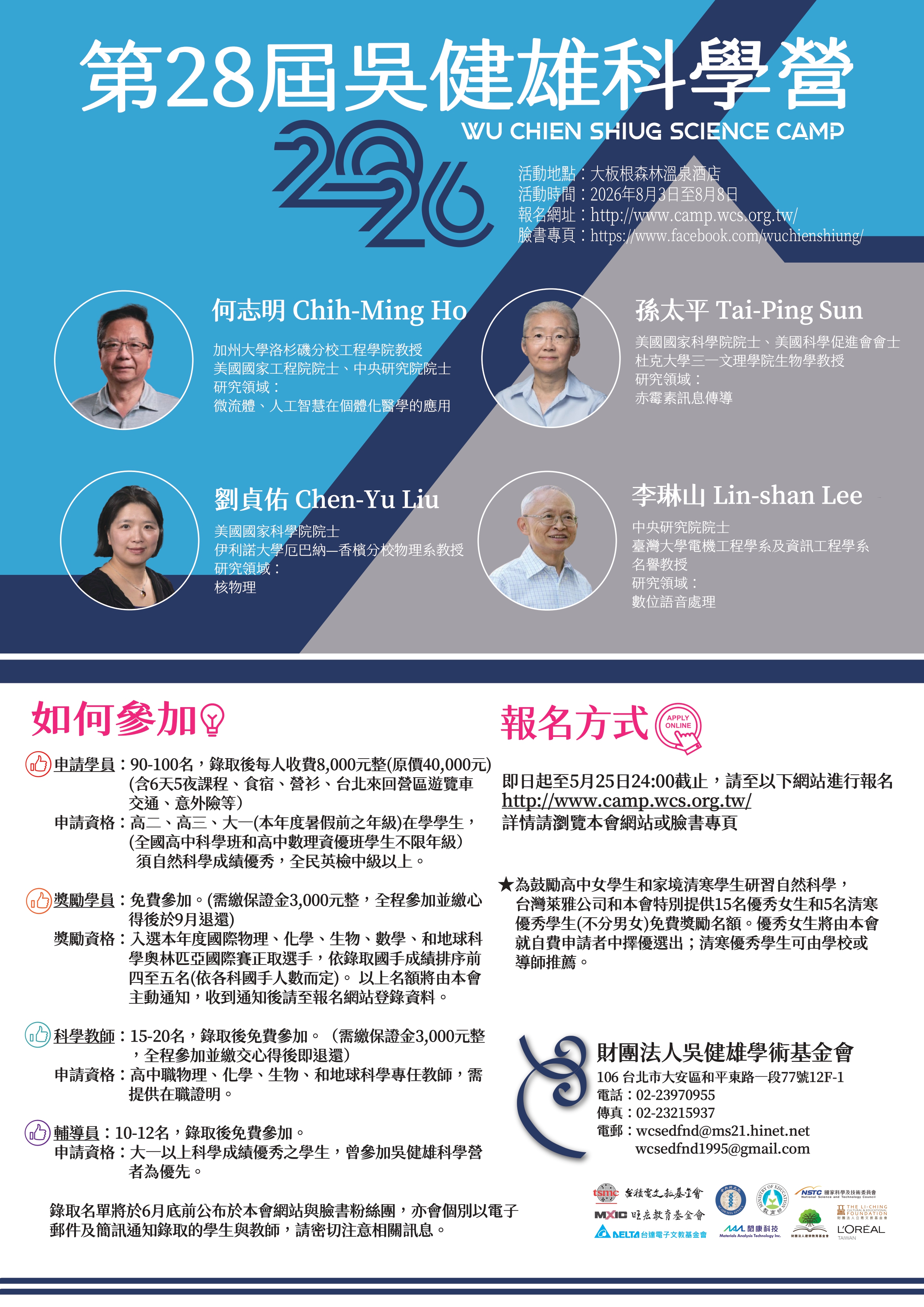 | 公告主旨 | 2026年第28屆吳健雄科學營 |