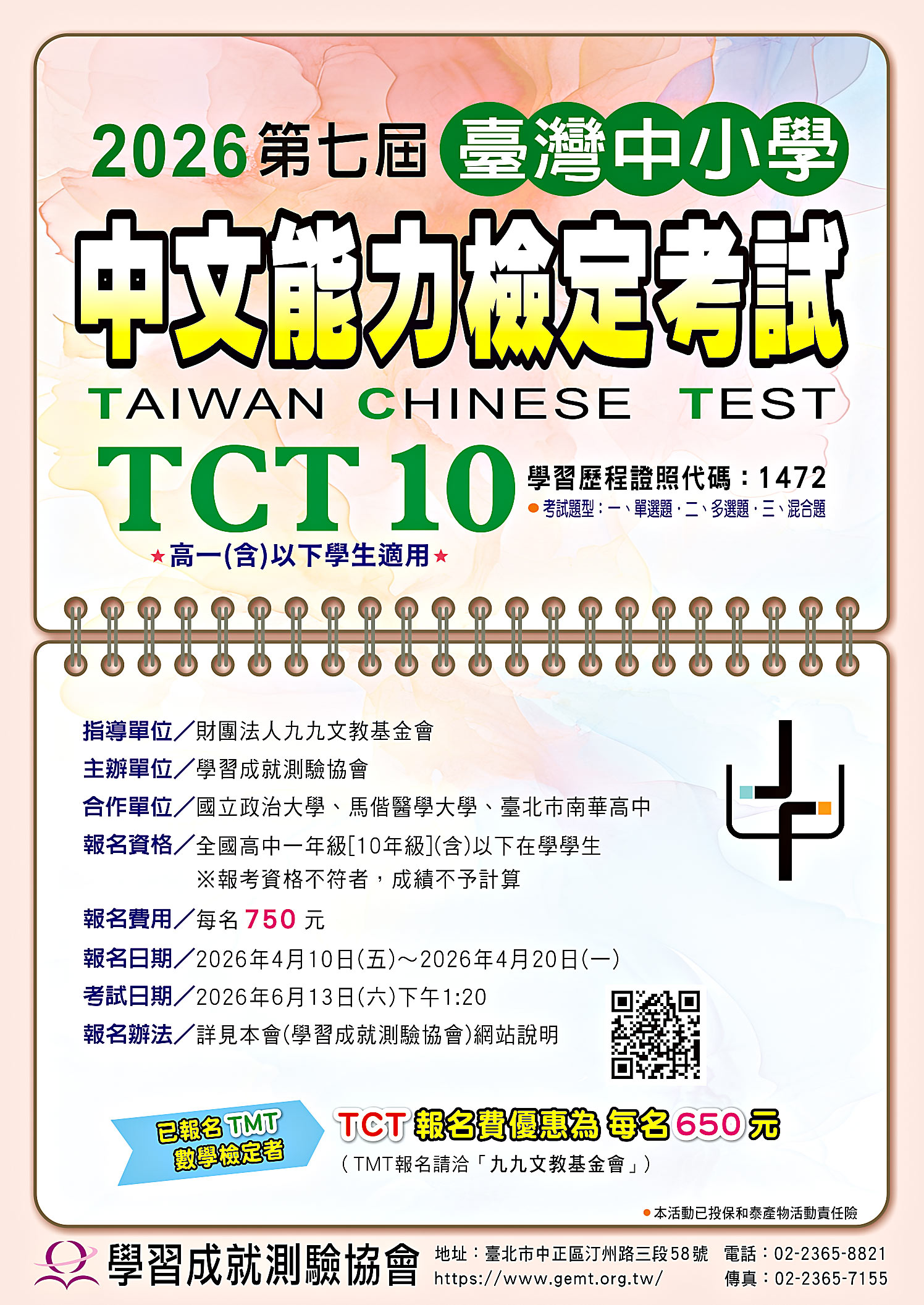 | 公告內容 | 依據學習成就測驗協會學測字第1150320001號函辦理。說明如下: 一、考試日期:2026年6月13日(星期六)下午1:20~3:00 二、報名資格:TCT10-高中一年級[10年級](含)以下在學學生 三、報名時間:2026年4月10日(星期五)~4月20日(星期一) 四、報名費用:每名學生750元,(中)低收入戶者回傳證明則免報名費(已報名TMT數學檢定者,TCT報名費優惠為每名650元) 五、未設考區之縣市如報名達一定人數,請與本會聯繫,必要時得增設考區 六、活動相關訊息及報名方式,請參閱附件或至本會網站查詢(網址:https://www.gemt.org.tw/) 七、活動簡章及報名表可自行影印使用,海報敬請公告周知。 |