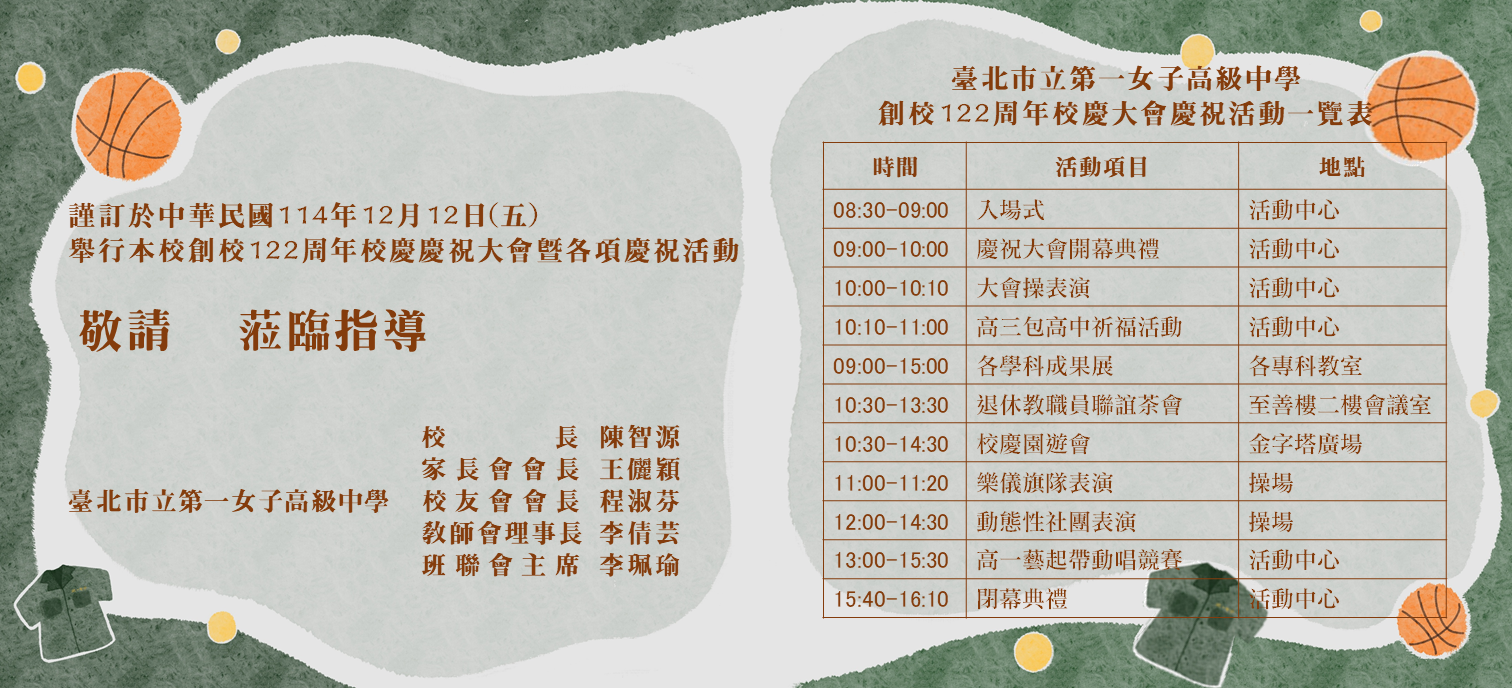 校慶活動 備註:12月12日校慶當日,外賓開放時間為上午8點至下午3點半,下午3點後不再開放入校 114校慶慶祝活動一覽表1201更新 114校慶慶祝活動一覽表1201更新 檔案名稱檔案大小檔案格式下載114校慶慶祝活動一覽表1201更新.pdf1.08 MB新視窗開啟檔案 114校慶慶祝活動一覽表1201更新.pdf (點擊下載檔案) 114校慶慶祝活動一覽表1201更新