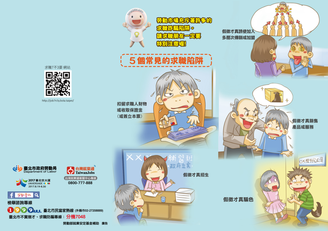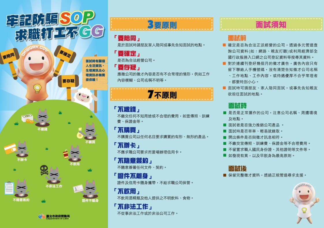 請以左、右方向鍵切換「打工保護、求職防騙三要七不、打工求職防詐、臺北市學生打工勞權常見問答」之頁籤